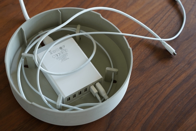 まずは下段にUSB充電器(別売り)を配置し、ケーブルを周囲に巻いて長さを調整します。